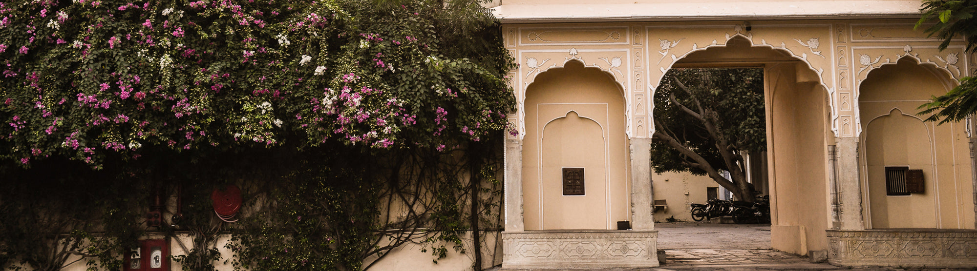 Daughters of India Kyra Maxi Dress in Fuchsia Bloom — full length by Moroccan arched wall, hand screen print cotton Daughters of India Kyra Maxi Dress in Fuchsia Bloom — seated on step, flowing botanical print, billowed sleeve