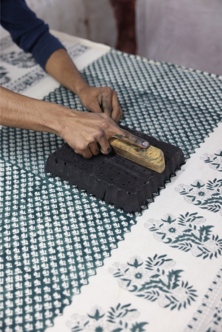 The Rooh Blouse in Pine truly romanticises the magic inherent in hand block printed fabric. With an array of florals in the most beautiful pine green on a cream base, this is an effortlessly feminine staple piece. Featuring delicately extravagant blouson sleeves with an elasticated cuff, and a sweet front tie flowing into a loose fitting bodice that can be worn freely or tucked into the waist for a more tailored look.